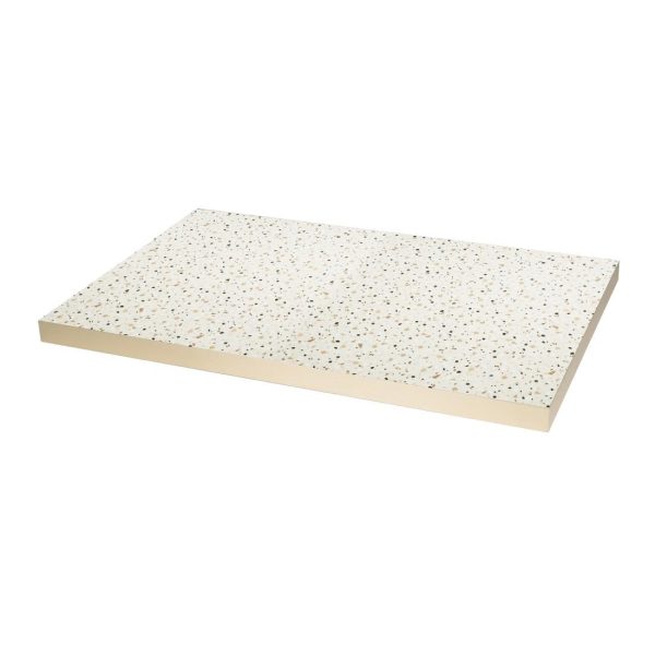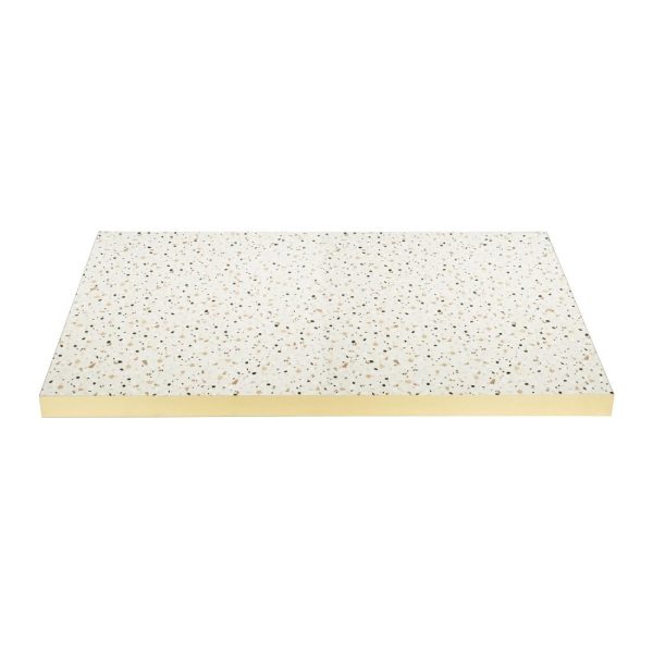 Measuring 1100x700mm in size, this Bolero rectangular table top boasts a vibrant terrazzo print design complemented by a premium brass-effect edge in aluminium film. It comes pre-drilled to fit Bolero table bases and is stain and scratch resistant for lasting use. For convenience, the surface of the table easily wipes clean, saving you time both before and after service.