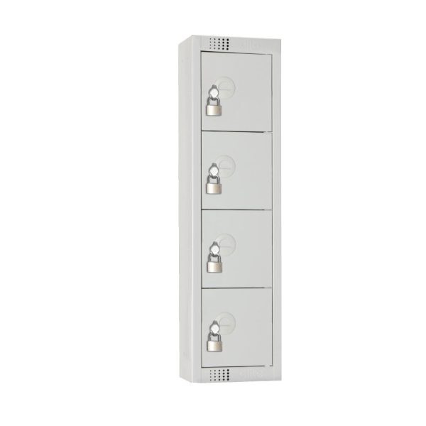 Four door lockers, designed for use off floor. Anchor against a wall on a load bearing raised platform. Ideal for the storage of all personal effects, including watches, personal jewellery, wallets, purses and mobile phones.