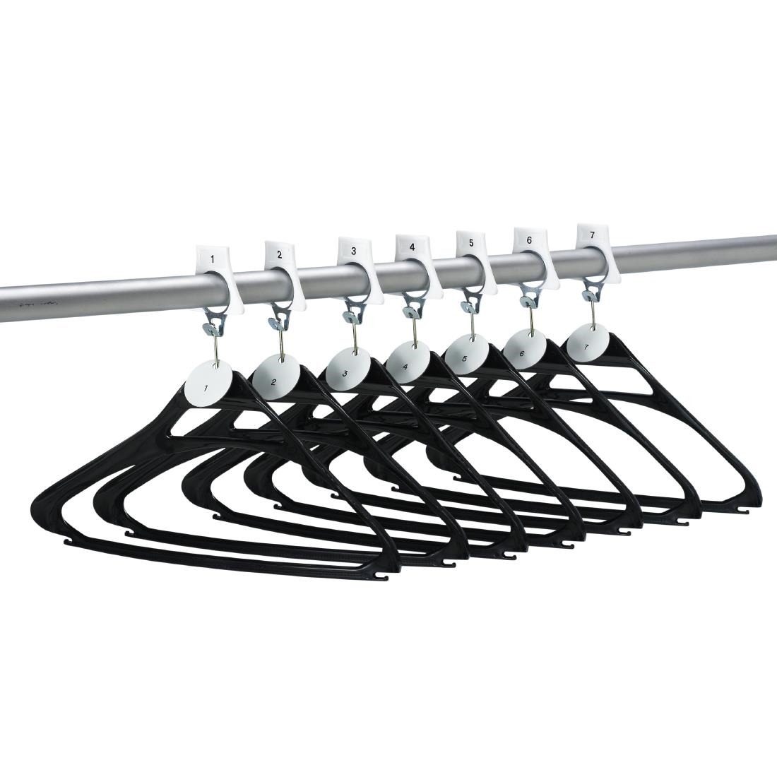 Organise your cloakroom for customers garments with these numbered hangers. Each hanger comes complete with a numbered security hook, which remains on the rail, and a numbered disc which is given to the customer. The disc is returned by the customer when they reclaim their coat. The coat hangers are manufactured in polypropylene and have nail-heads which slot into the numbered security hooks. These consist of a metal ring with a plastic outer sheath which includes the security number. The numbered disks are manufactured using a two-layer plastic sandwich with the number engraved through the white face of the disc to show the black layer underneath. Number sequence 1-100.